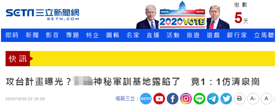 来源:环球网、新浪网 原标题:攻台计划曝光?绿媒又对号入座:大陆神秘军训基地1:1仿造台湾清泉岗 [环球网报道 记者赵友平]“攻台计划曝光?”爱对号入座的绿媒又来了。台湾“三立新闻网”今天(30)...
