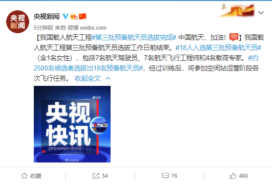 来源:央视作者:央视新闻、新浪网 原标题:我国载人航天工程第三批预备航天员选拔完成 中国航天,加油! 我国载人航天工程第三批预备航天员选拔工作日前结束。18人入选第三批预备航天员(含1名女性),包...