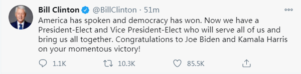 刚刚,克林顿向拜登及哈里斯送出祝贺