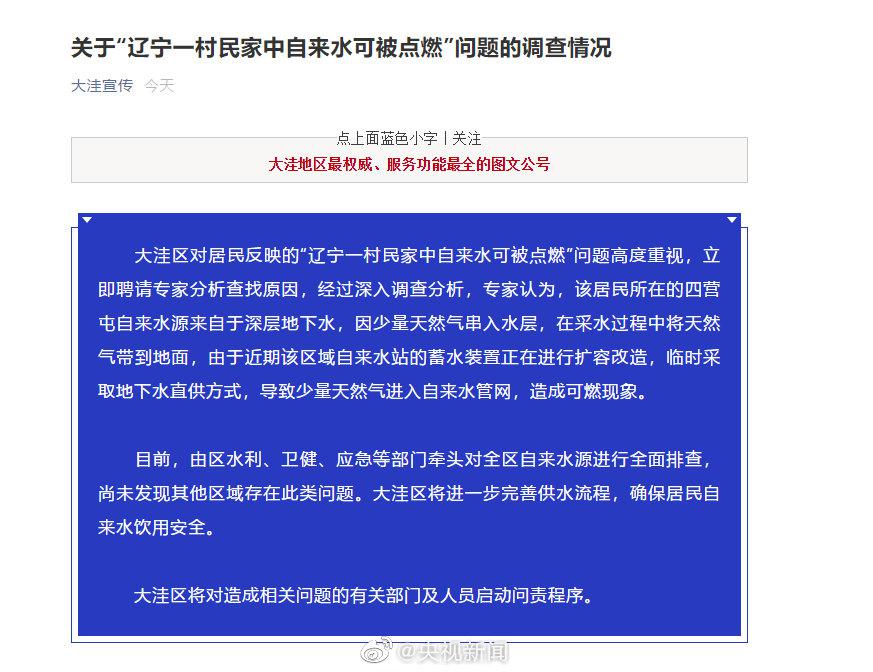辽宁一村子自来水能点燃,联合调查组介入