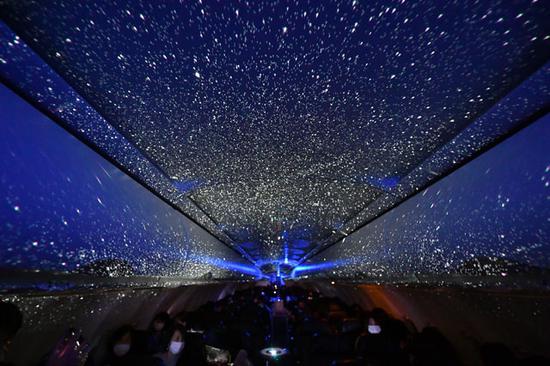 海外网10月19日电 当地时间17日,日本星悦航空公司进行了一次特别飞行,六台超小型天象仪将各式星图投影到机舱顶部,乘客们可以在万米高空欣赏“漫天星辰”,还可以同时观察窗外的繁星。