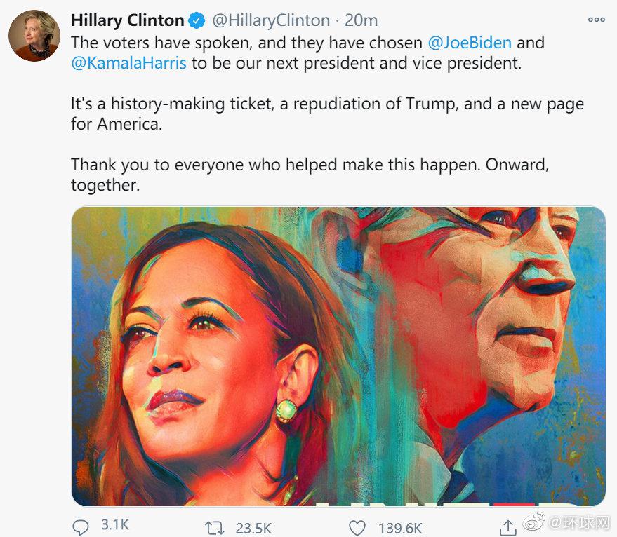 “选民已经表态,他们选择了拜登和哈里斯作为我们的下一任总统和副总统。”希拉里在推特上写道,“这是一张创造历史的门票,是对特朗普的否定,也是美国的新篇章。感谢所有帮助实现这一目标的人。继续前进,一起努力。”